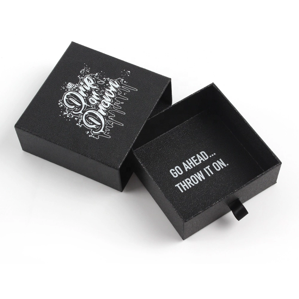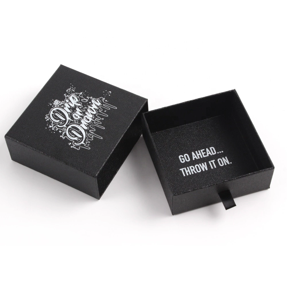 This pull-out packaging box features a hot-stamped white logo, creating a striking black and white contrast that makes the logo stand out even more. To further protect the jewelry, you can add foam or a fabric pouch to secure the items, preventing them from shaking inside the box and potentially getting damaged or scratched, thus improving the customer’s unboxing experience.