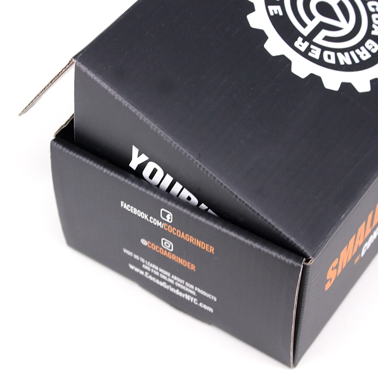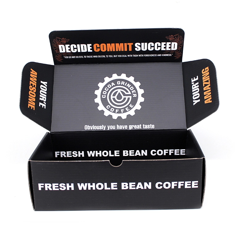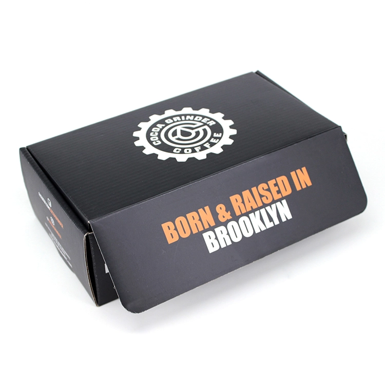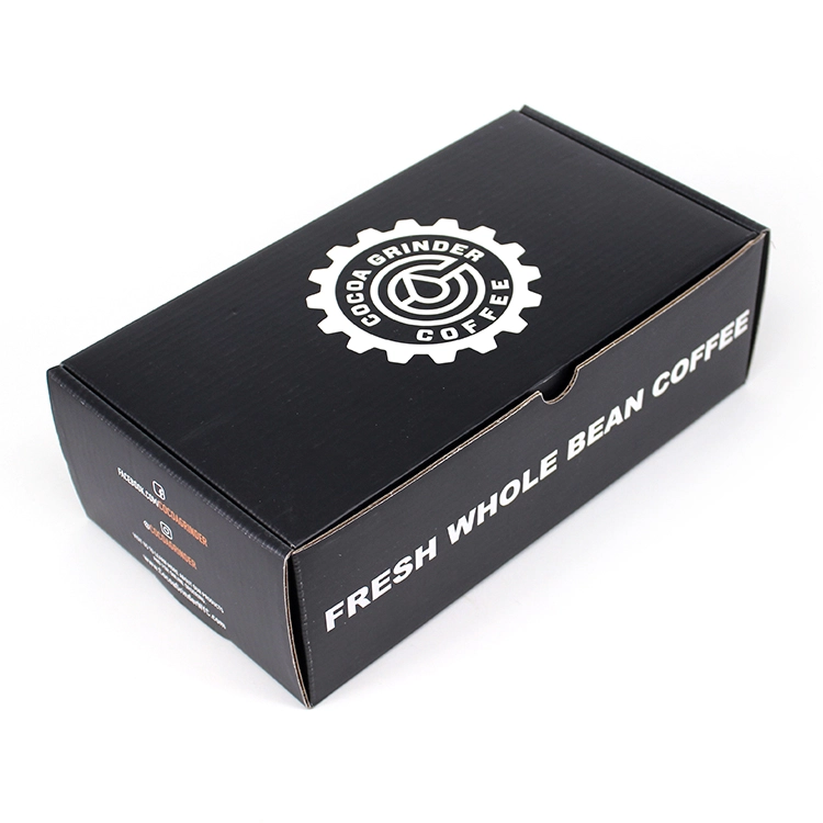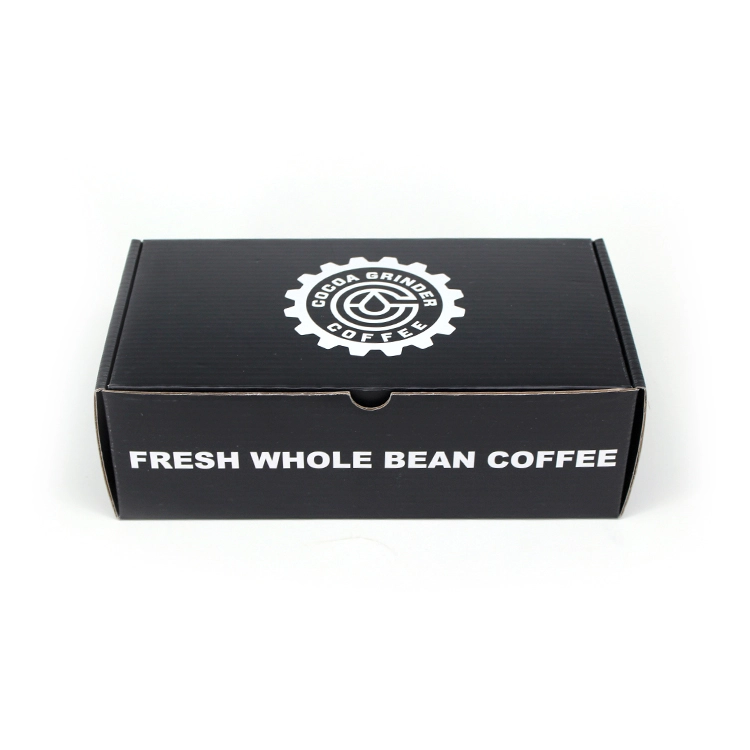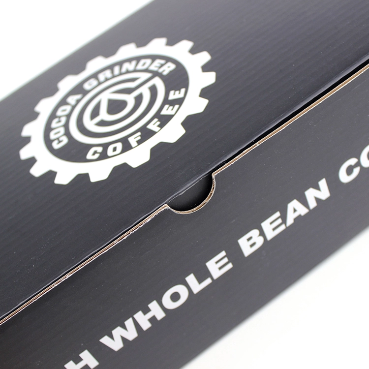 This black shipping box is used to package and transport coffee beans. The color of the box perfectly matches the color of the coffee beans. The box is also double-sided printed, which requires at least three layers of paper. This ensures the box is thick, hard, and dense, making it ideal for fragile items, glassware, and food that’s sensitive to crushing.