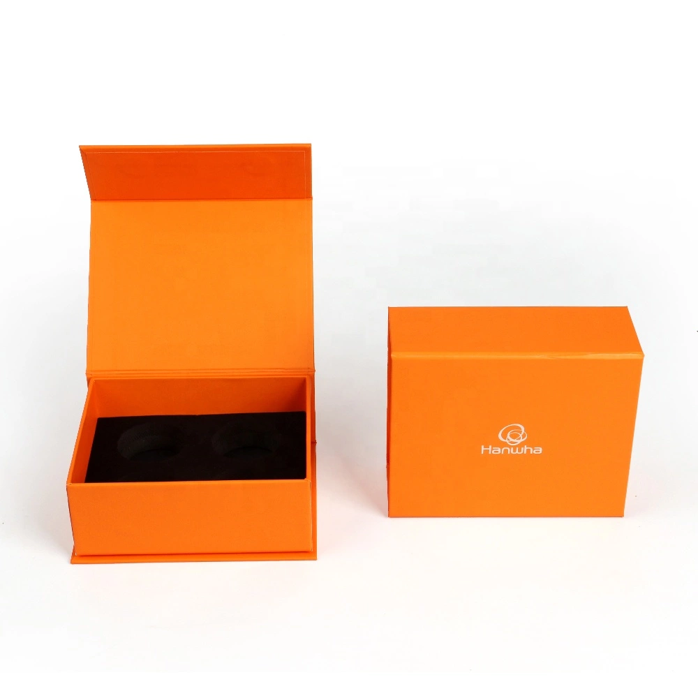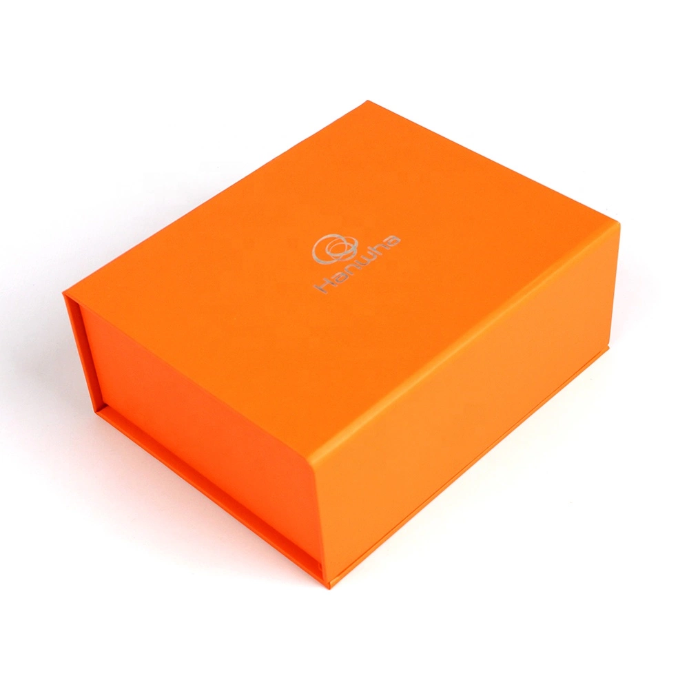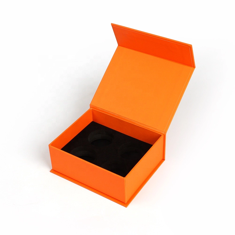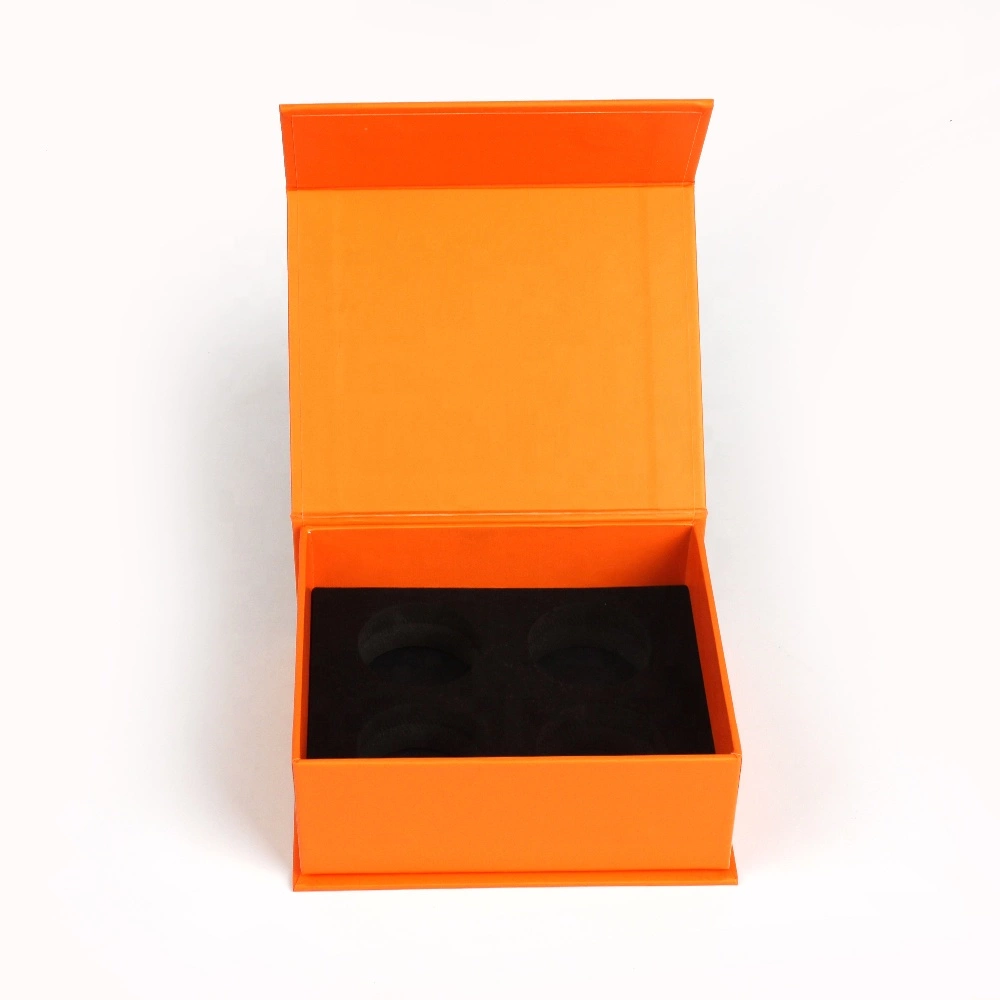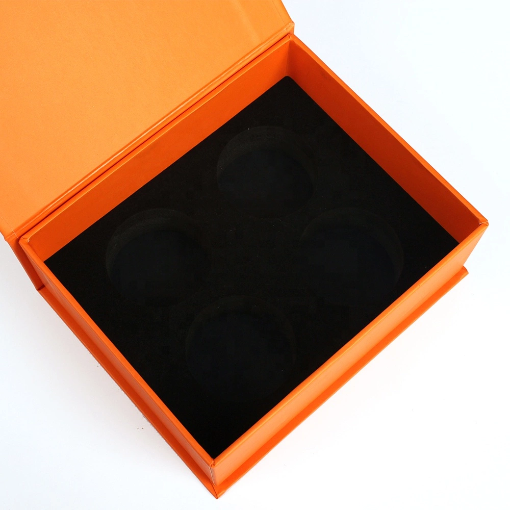 This is a box of golf balls that can hold four golf balls. It is made of magnetic closure and rigid board material. Its color is relatively simple, with only a single pantone orange color, and the logo uses a hot silver stamping process.