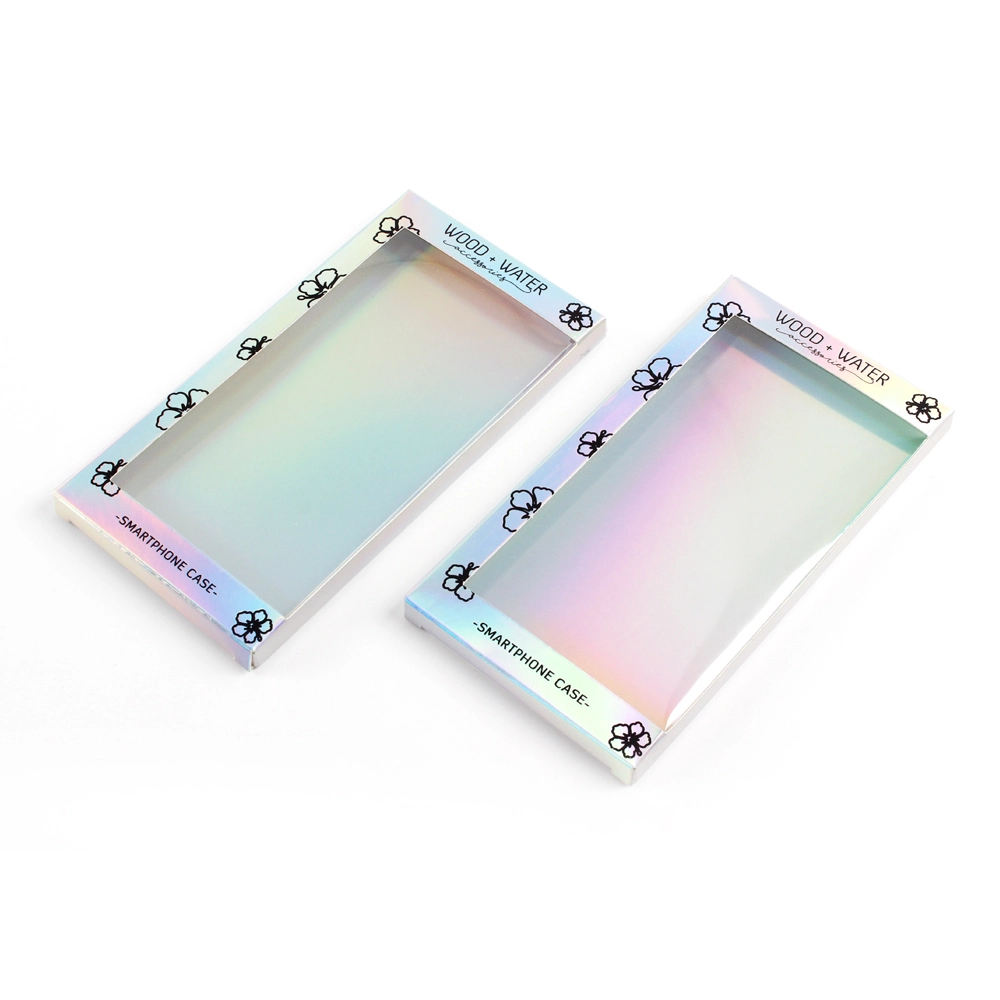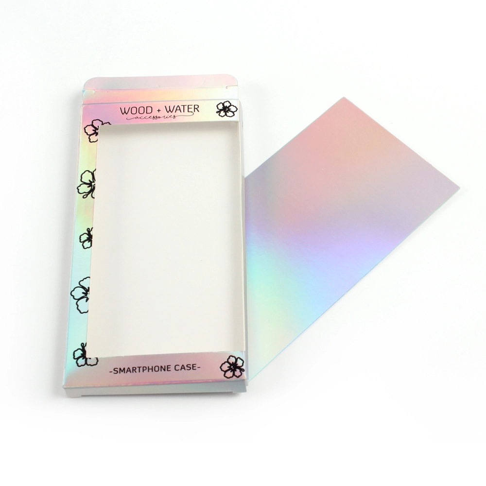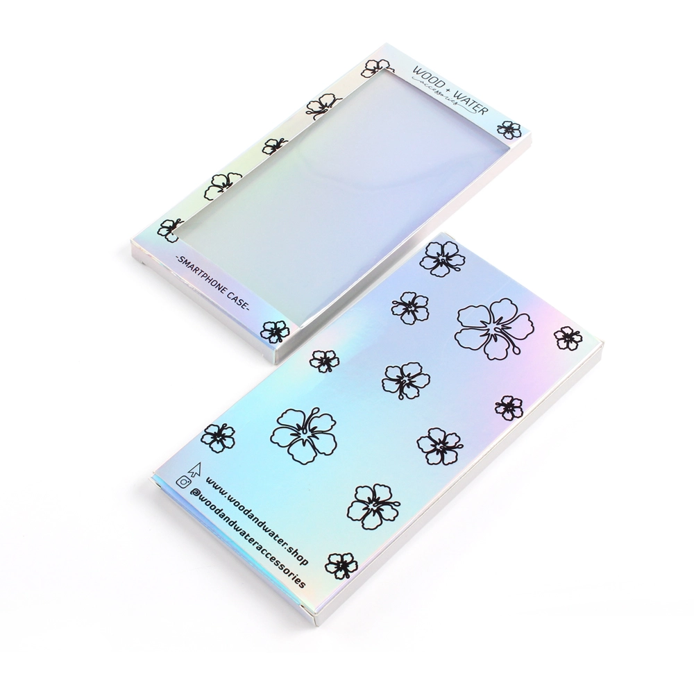 This box of phone cases is a very distinctive packaging box for mobile phone cases. It’s made of laser-treated cardboard, giving the paper itself a silver, iridescent effect. Furthermore, this box doesn’t use traditional printing; instead, it utilizes a hot stamping process with black foil to display the logo and design. Unlike ordinary paper, printing on metallic cardboard is difficult and requires a UV printing machine, which is significantly more expensive than a standard printing press. Therefore, considering the cost, hot stamping the logo and patterns is perhaps a better and more economical option.