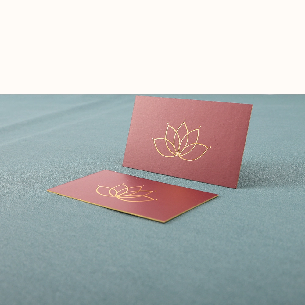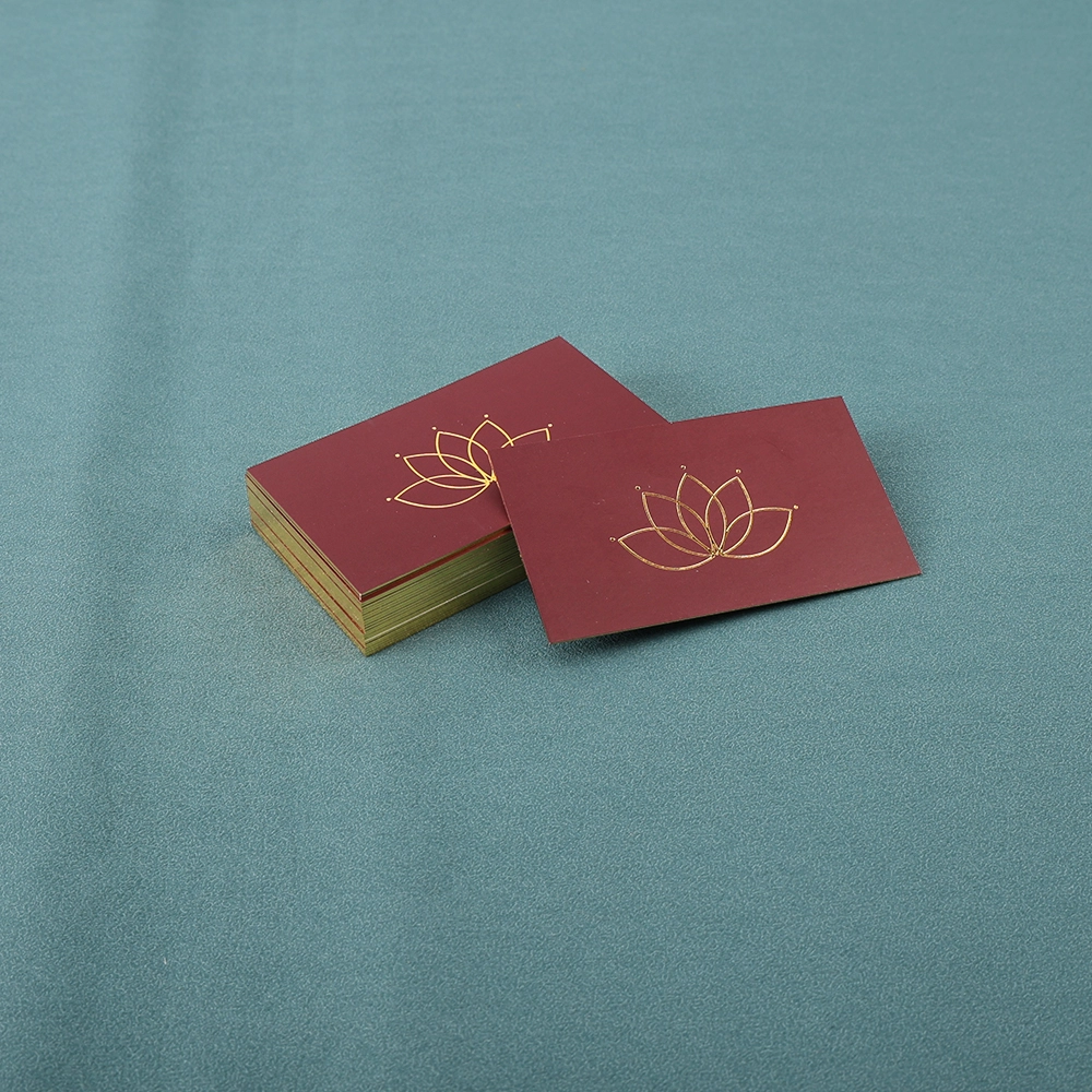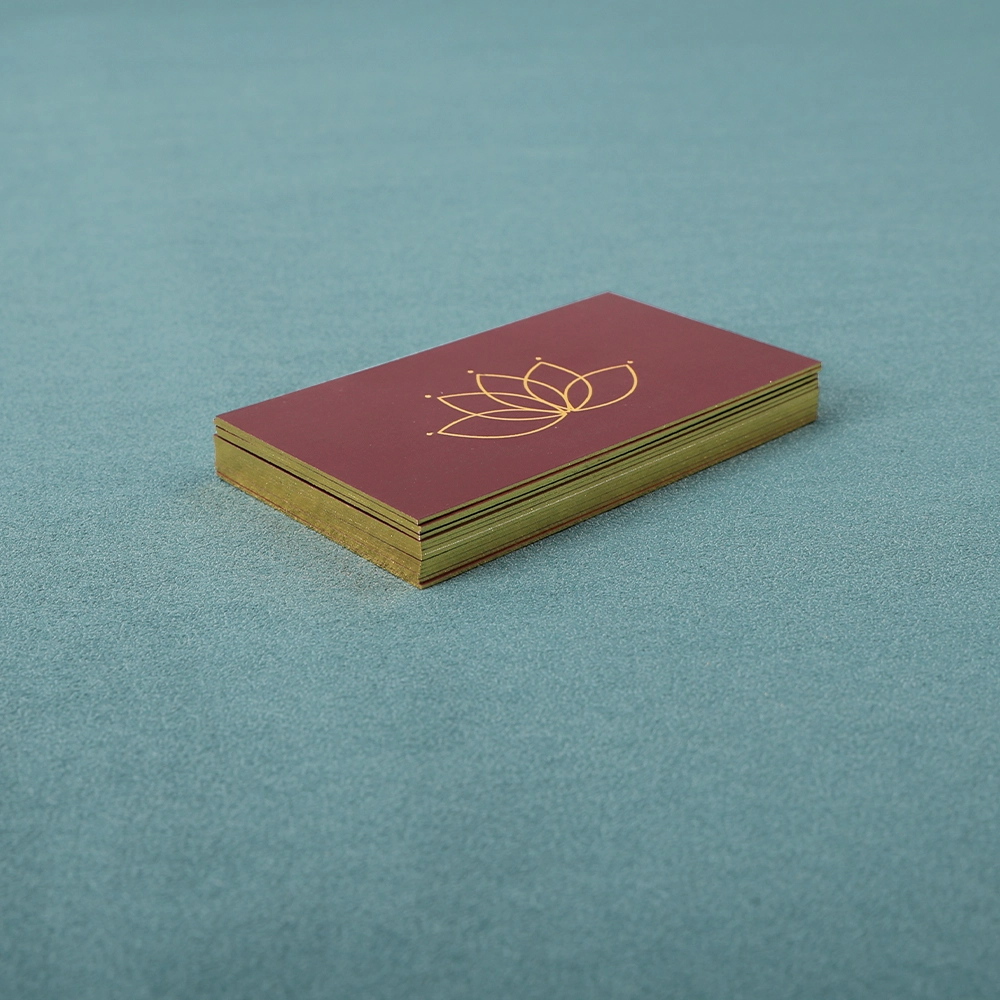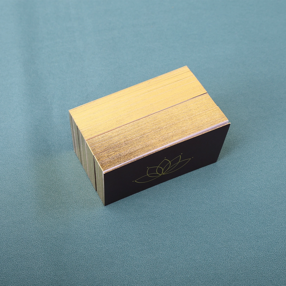 The business cards are printed using four-color offset printing, and the logo features gold foil stamping. The solid color background combined with the gold foil logo creates a luxurious and professional look. The most unique feature of these business cards is that all the edges of the cards are finished in gold, making them look incredibly dazzling when stacked together.