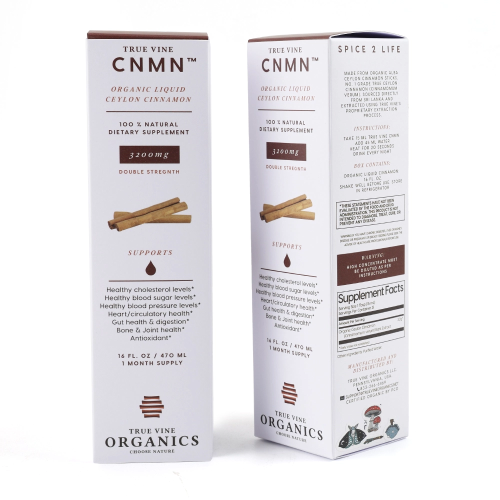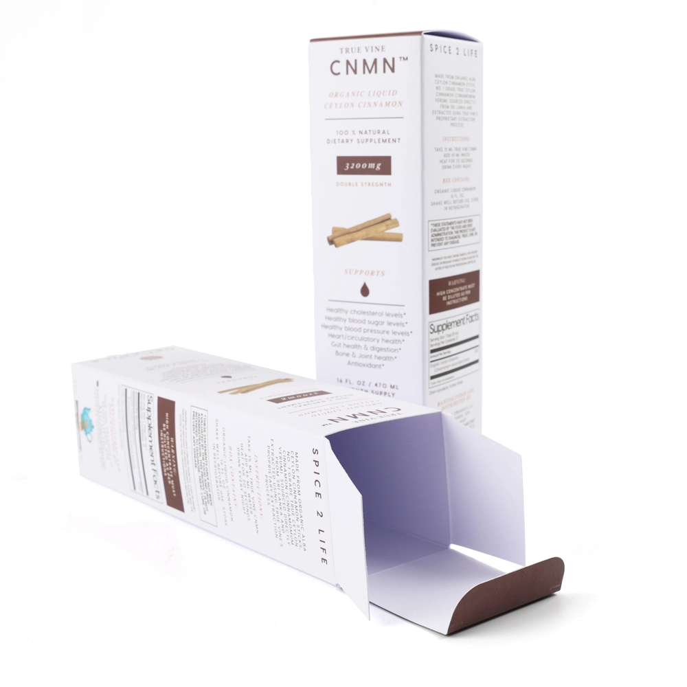 These custom food boxes are cinnamon dietary supplement packaging boxes. The material is cardboard without film, and the box type is a cardboard box that can be opened from the top and bottom. The film-free material makes the packaging very environmentally friendly, supports recycling and degradation, and is a very suitable material for food packaging.