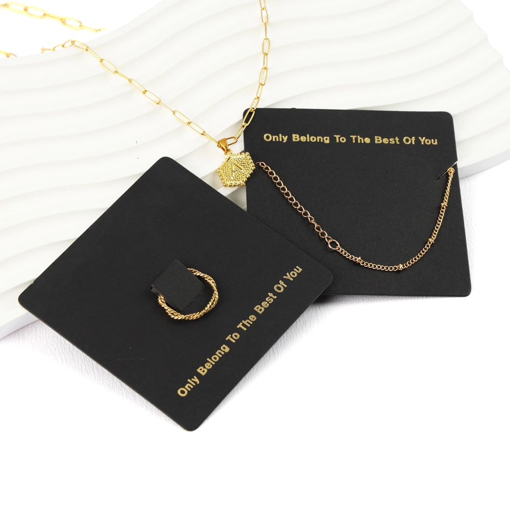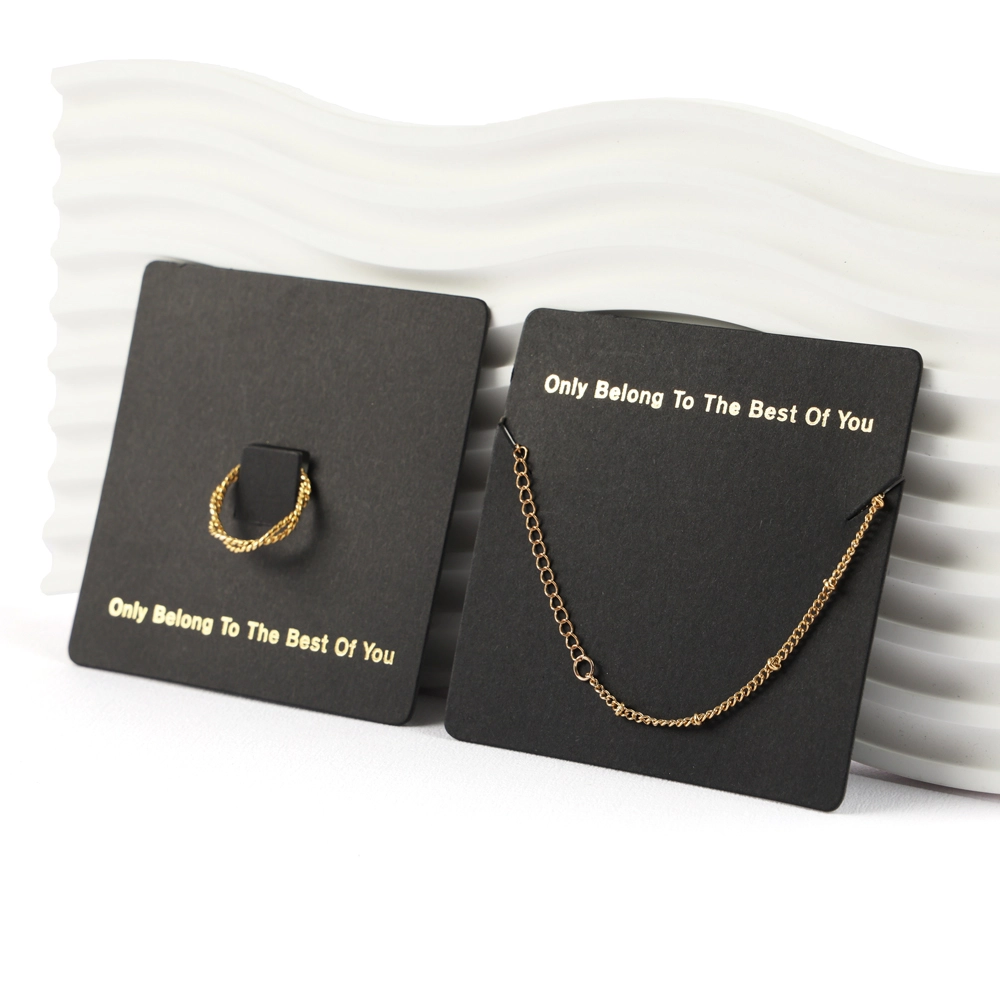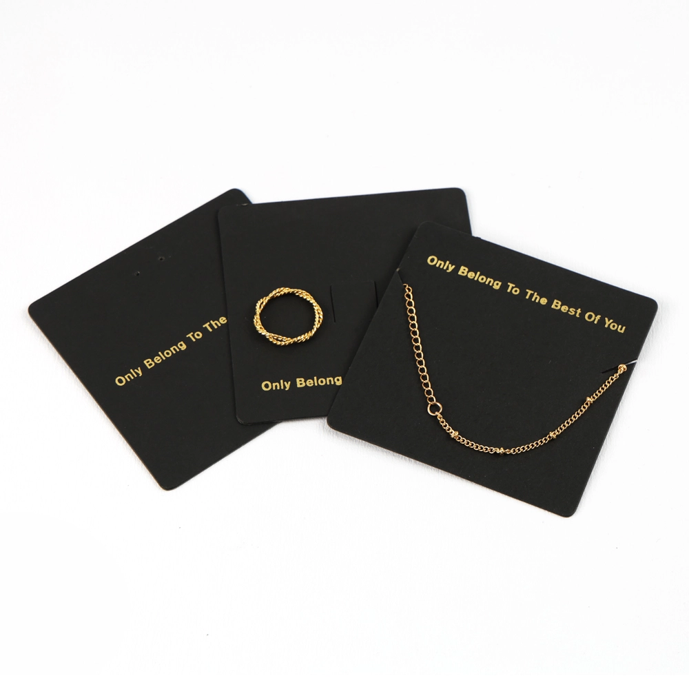These are black custom jewelry display cards. We’ve created three different cutouts for rings, necklaces/bracelets/anklets, and earrings. If needed, we can combine all three cutouts on one card and increase the card size to meet all your needs.