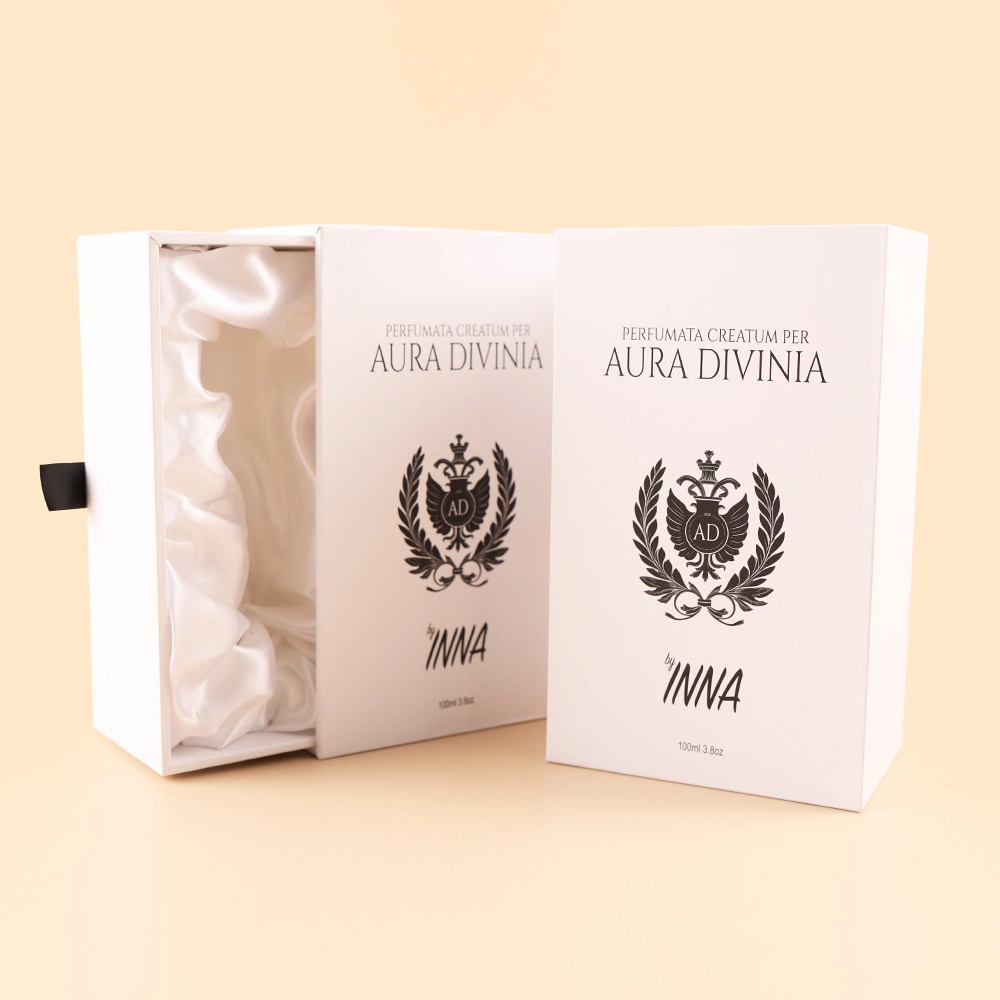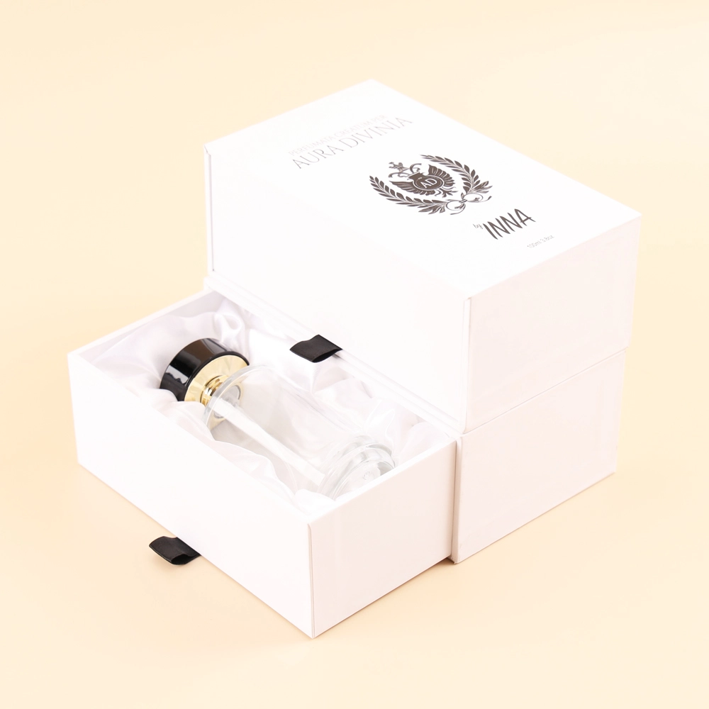 This luxury perfume box is a pull-out style and comes with a ribbon. The ribbon is made at the bottom of the box instead of in the middle of the conventional box, which can increase the beauty of the box. Perfume boxes are usually made of cardboard like this box, which is stronger and more resistant to pressure than ordinary cardboard boxes, because perfumes are usually in glass bottles and are more fragile.