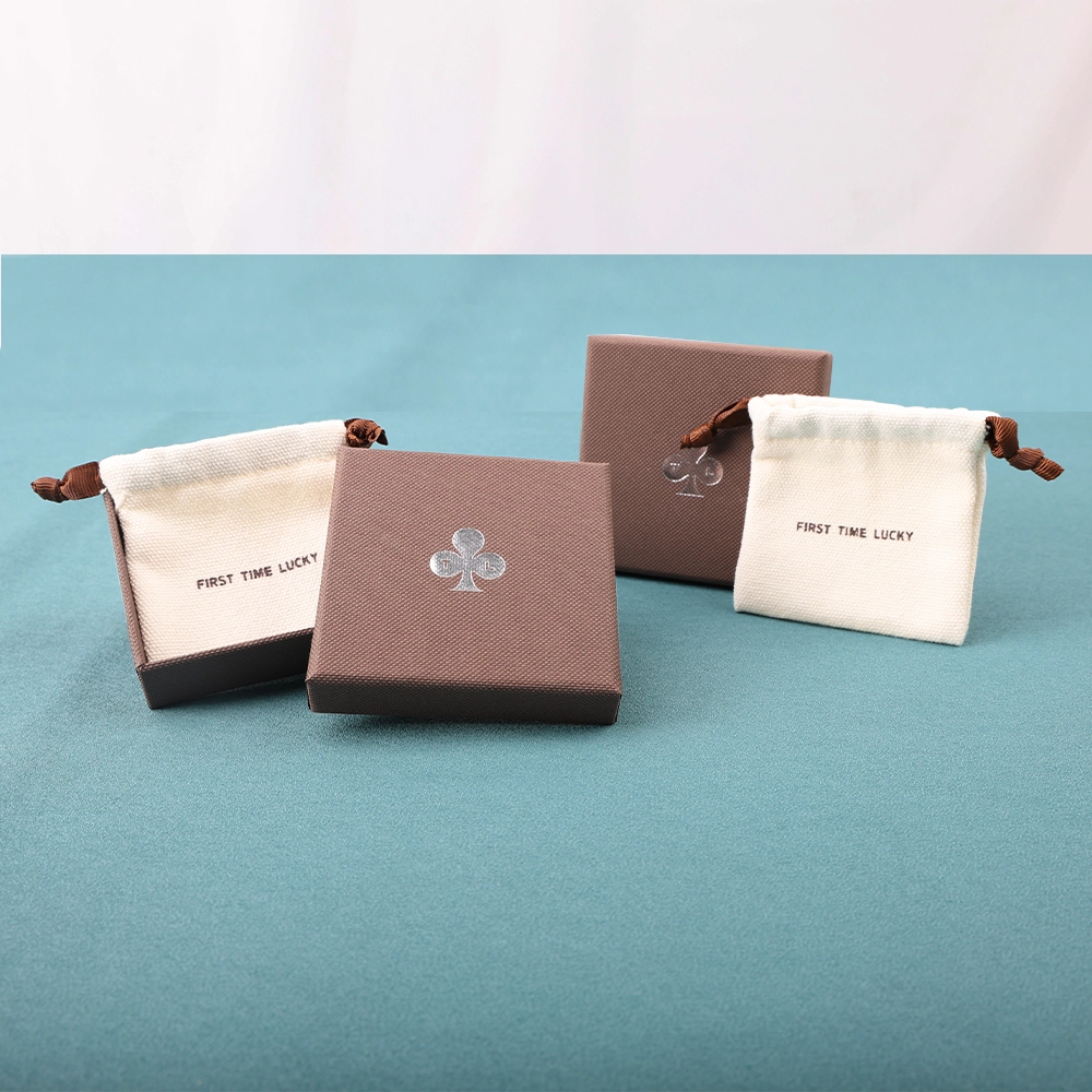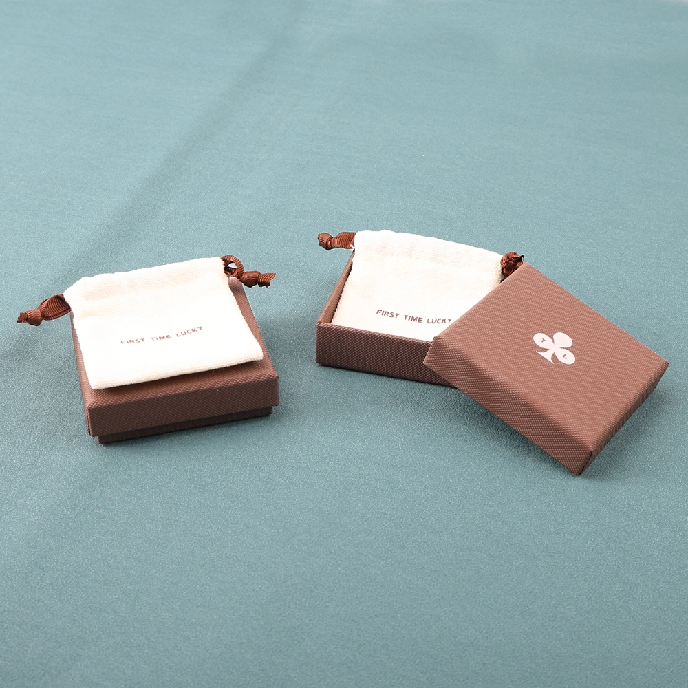 Because it eliminates the steps of printing, lamination, and embossing, the production time for this jewelry packaging box is significantly reduced, thus avoiding excessive waste. This packaging box does not include a sponge lining, but the price includes a cotton bag, and custom logo printing is also available.