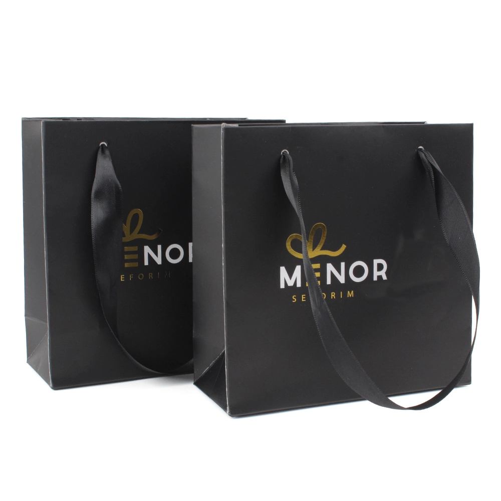 This paper bag with handle is perfect for wrapping gifts and gift cards. This size is also ideal for packaging jewelry, cosmetics, makeup, small toys, and more. This paper bag is only available in black, with the logo hot foiled in gold. The ribbon is black color to match the bag’s color.