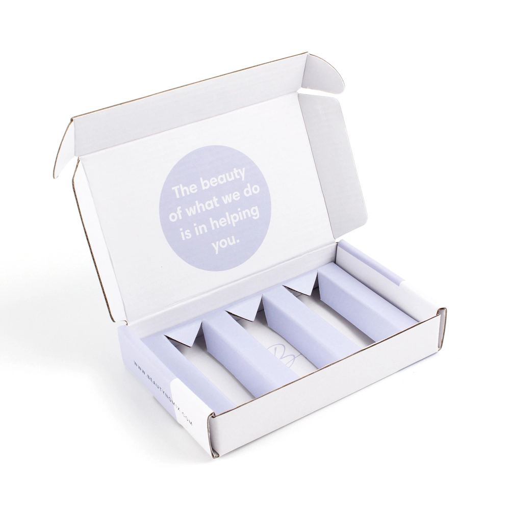 These small shipping boxes are a compact size, ideal for packaging and shipping cosmetics and beauty products. It uses a three-layer paper construction, with an E-flute corrugated layer in the middle and two outer layers of 250gsm white cardboard suitable for printing, lamination, and hot stamping.