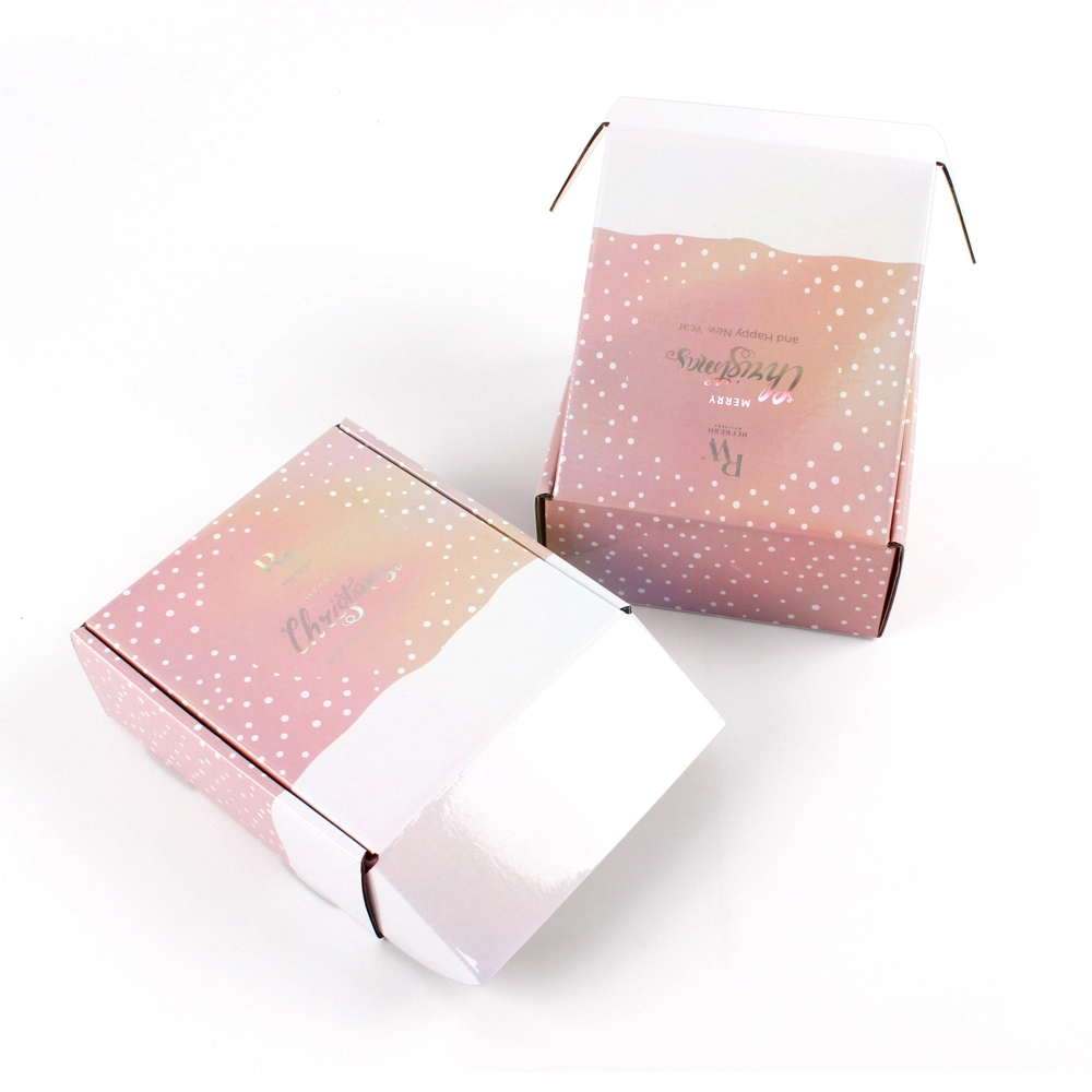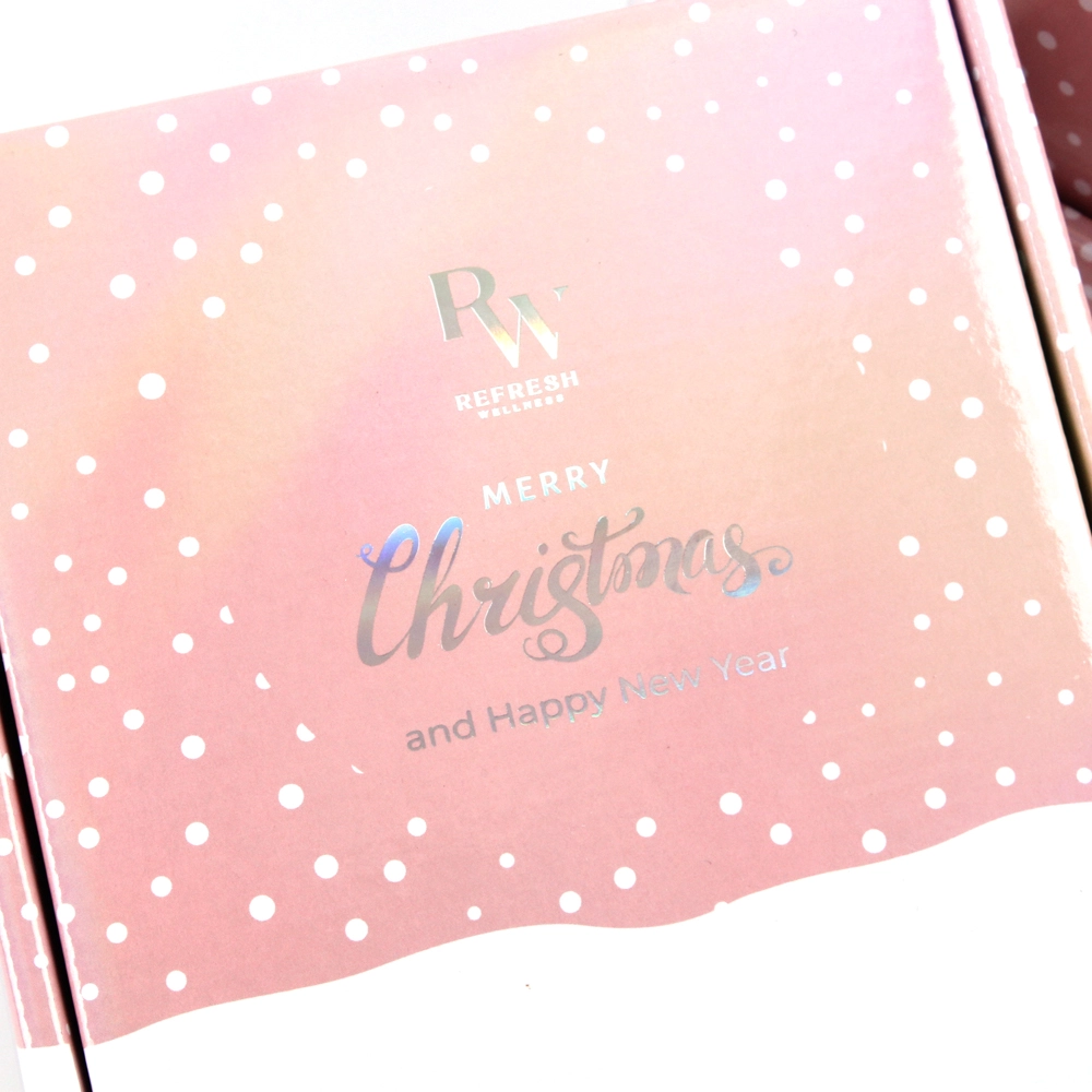 This packaging box utilizes lamination and hot stamping techniques. The lamination uses a film with a holographic effect, and the hot stamping also uses a holographic color. Therefore, the logo and the film create a harmonious effect. This pink shipping box not only reflects the product type but also conveys a touch of the brand’s personality.