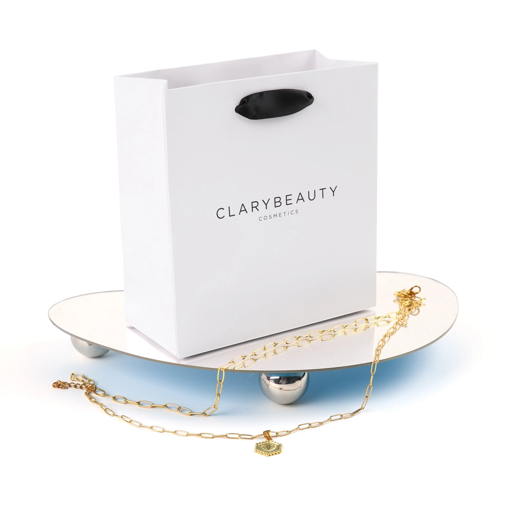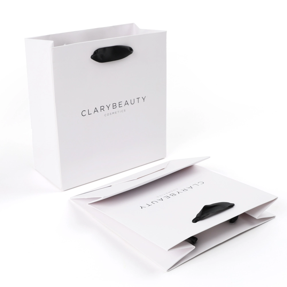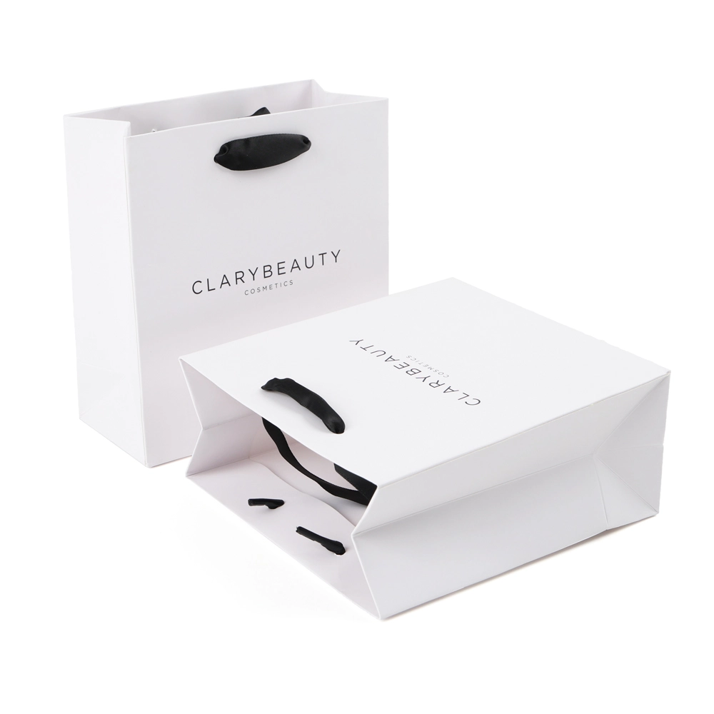 These white paper bags with handles are cosmetic packaging bags and shopping bags. With a simple color palette of white and black, it’s suitable for any product. There’s no need to customize packaging for different products, making it universally applicable.